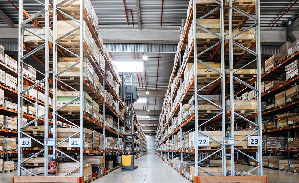 Pallet racks were installed in the facility with these requisites in mind. These racks stand 8 m high and, overall, offer a capacity to hold 41,749 pallets. It is a highly versatile storage system and one that adapts to the products’ sizes. Beams can be readjusted so that the storage slots are either bigger or smaller. There, the company’s team deposits wooden pallets and containers, for the most part.