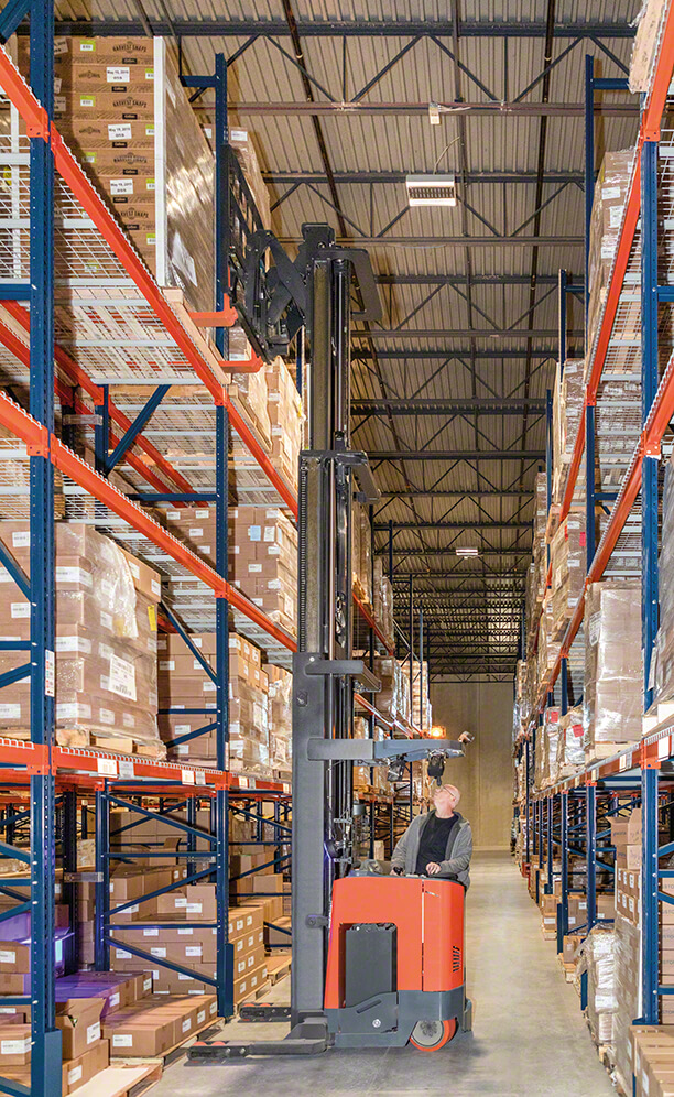 The pallets are temporarily positioned on the floor where operators, using radio frequency devices, update the inventory and verify the goods before placing them on the shelves. Items destined for picking are stored at the lower level, leaving the higher level for reserve goods.