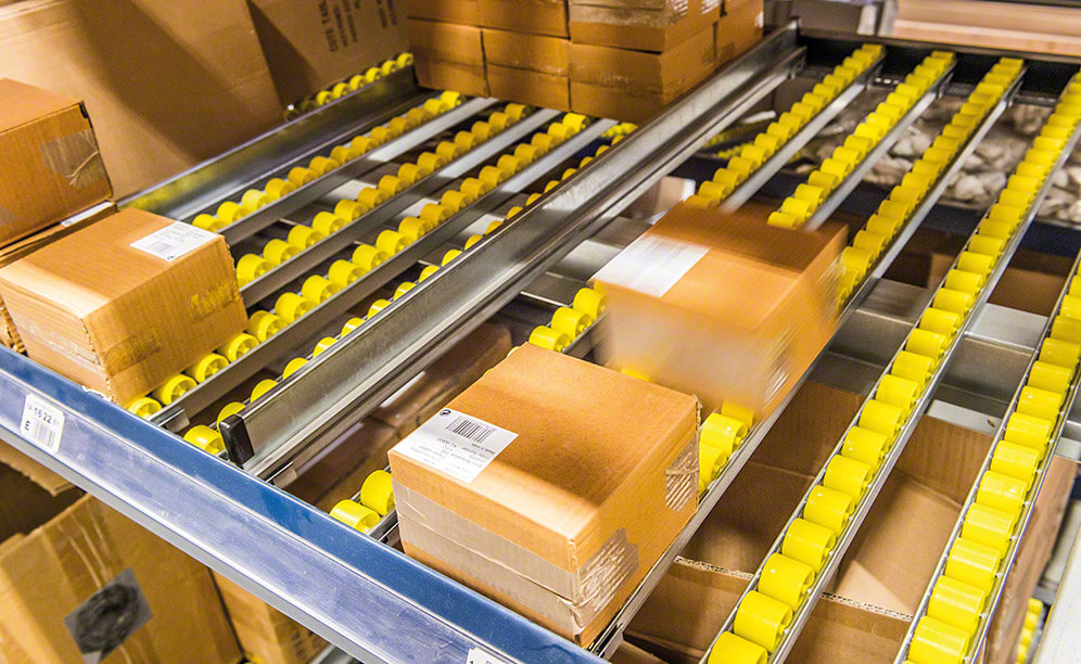 Bottom levels are arranged with live channels where they deposit boxes with consumer products. These shelves consist of roller tracks and are slightly inclined, so boxes slide via gravity. Picking involves collecting items from the front row box.
