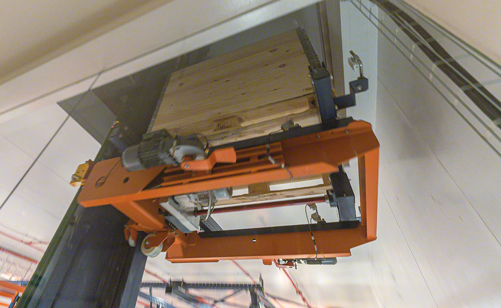 - Automatic connection with production: a pallet lift ensures the uninterrupted supply of the production lines. Following the manufacturing process, the finished products are sent down to be stored on the shelves.