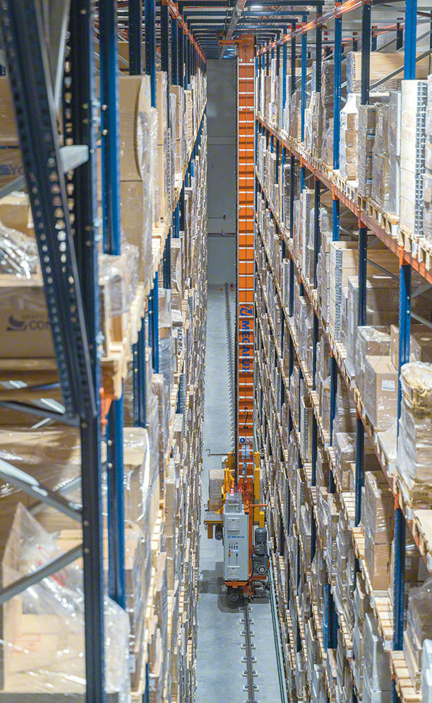 One of the aisles is reserved for finished products, while the other stores packaging components. In each aisle, a stacker crane automatically inserts and removes goods into/from their locations as per instructions from Mecalux’s Easy WMS warehouse management system. Both aisles are interconnected by means of two lines of conveyors that transfer the goods.
