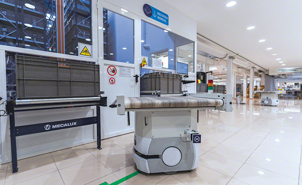 Normagrup’s priority with this solution was to have fully automated operations, ensuring that the handling equipment moved the goods continuously and safely. Therefore, in each aisle, a stacker crane quickly inserts and removes the boxes from their locations. It then moves the boxes to the front of the warehouse, where the conveyors are located. Once there, the AIVs pick up the goods and transport them to one of the three production lines.