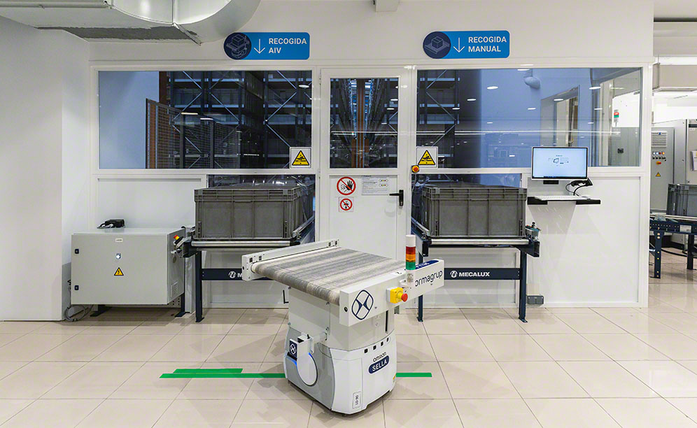 One of Normagrup’s most ambitious projects was the commissioning of a 7-metre-tall automated storage and retrieval system (AS/RS) with a capacity for 8,000 boxes. This AS/RS is vital for the development of the other operations in the production plant: storage, dispatch and distribution of the raw materials to the manufacturing area. For this purpose, four autonomous intelligent vehicles (AIVs) have been installed to connect the three production lines.
