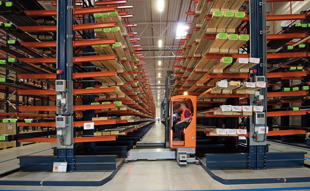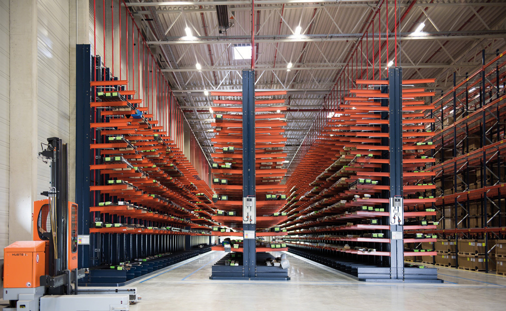 The two storage areas have very similar characteristics. Both are composed of conventional and cantilever racks for pallets, which classify goods based on their dimensions. In this way, the operations of the workers are made more flexible, using reach trucks and four-way side lifting forklifts.