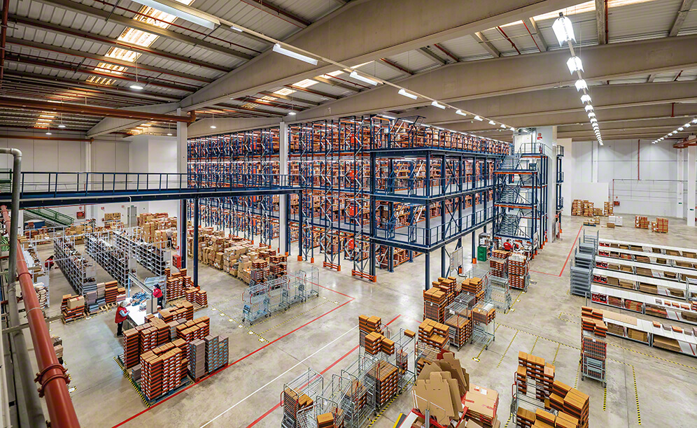 Mecalux has equipped the Pikolinos logistics centre in Elche with a block of shelving for picking. On top of these shelves are raised aisles that create a total of four floors. This solution has the advantage of using the entire height of the warehouse, which has multiplied the useful storage area by four. This results in greater storage capacity.