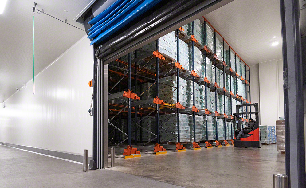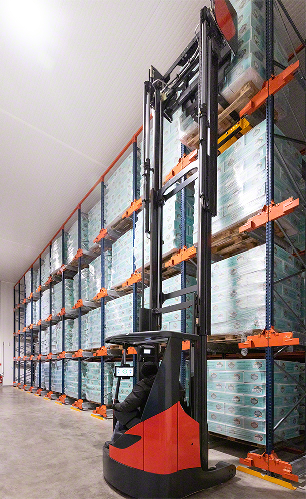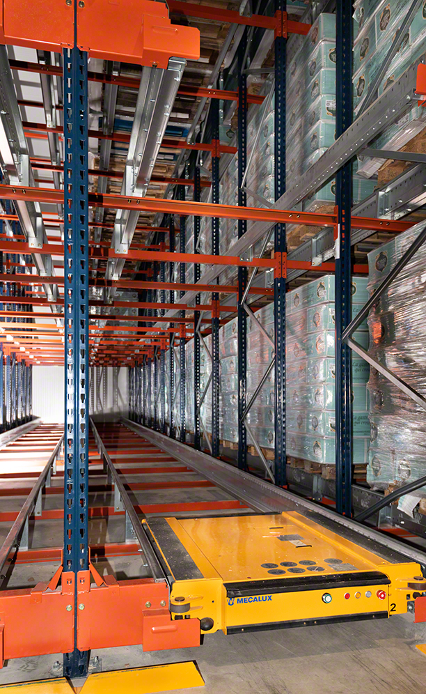 The warehouse contains two chambers. One works at room temperature and the raw materials to be sent to production are deposited there. The other operates at a controlled temperature of 2 ºC and is meant for finished products. In both, Mecalux installed high-density pallet racks served by Pallet Shuttles. The racks are 8.5 m high and comprise lanes with support rails on each side on which the Pallet Shuttle runs and, at the same time, where the pallets are stored.