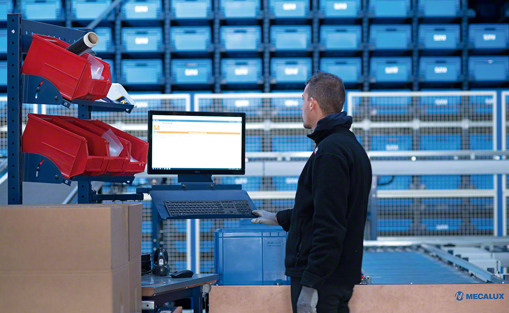 Each operator can prepare up to nine orders simultaneously: four in boxes, four in envelopes and one on a pallet. The operators remove the units from inside the boxes automatically brought to them from the warehouse and place them in the corresponding orders. Once the orders are finished, they are moved to the area in which they will be consolidated with bulky products from the pallet racks. These completed orders are then packaged, banded and labelled, and the document required for their dispatch is issued.