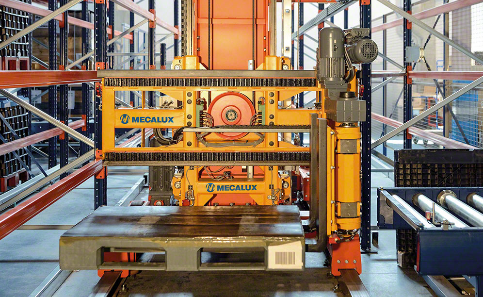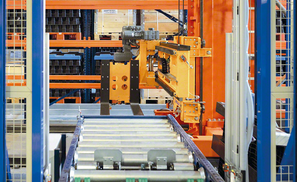 The warehouse comprises three levels of conveyors (the ground floor plus two above). Thus, inputs and outputs of the different warehoused products can be better organised and interference avoided between the two operations. Each one of the levels is connected to a different production line.