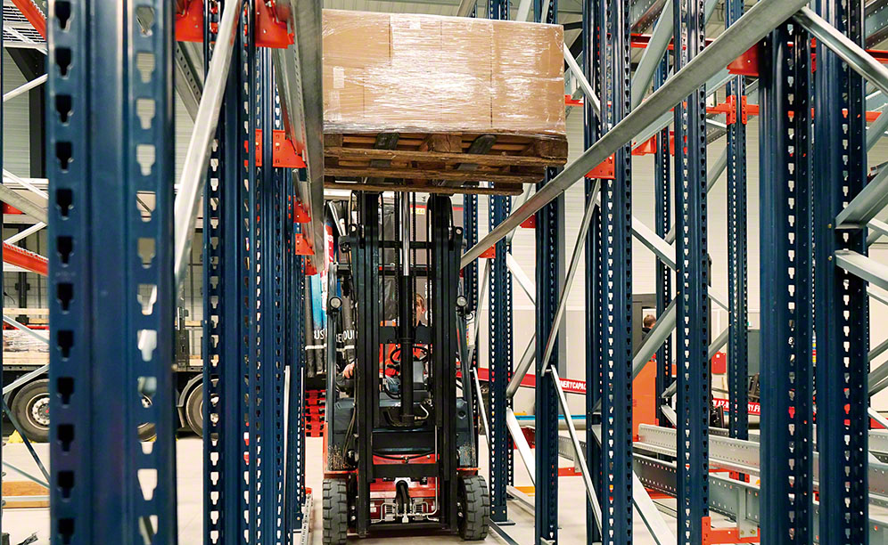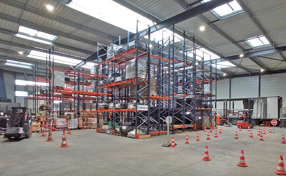 The facility is equipped with several storage solutions: pallet racks, live racking, drive-in racks, and racks with the Pallet Shuttle system and locations for picking. Likewise, Mecalux has implemented its Easy WMS warehouse management system with 15 licenses and radiofrequency scanners.