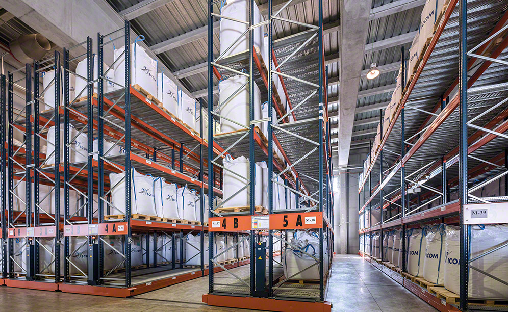 After analysing Vicom’s requirements, Mecalux equipped the warehouse with two blocks of Movirack mobile pallet racking. The first of these has seven mobile racks and the second has nine. Big bag type sacks are stored here on top of pallets.