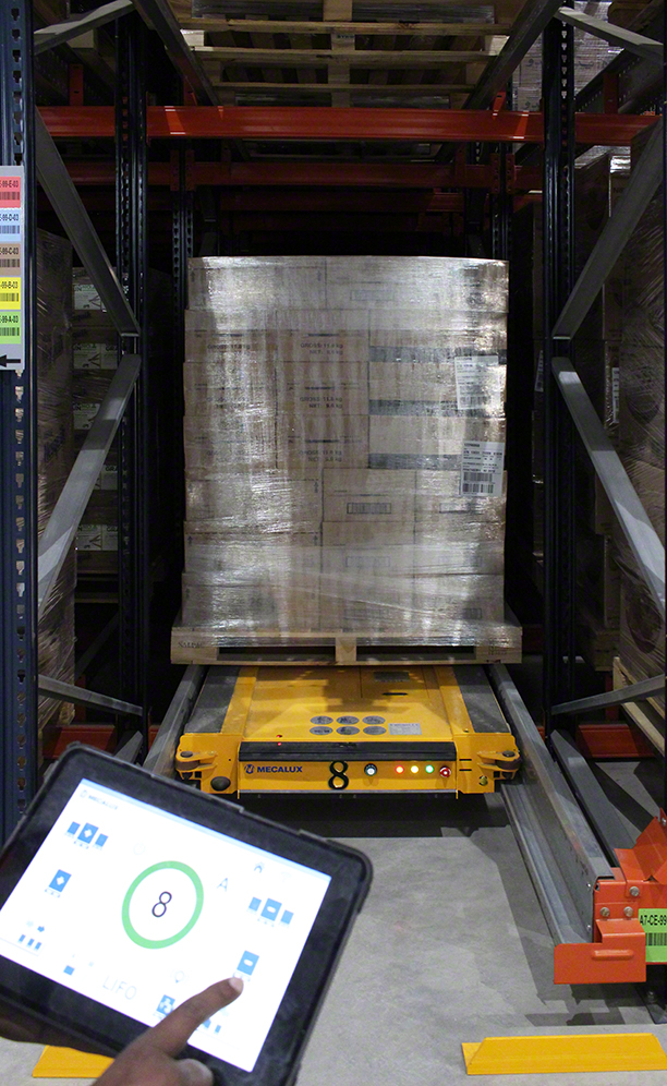 The warehouse includes four blocks of racks with the semi-automatic Pallet Shuttle system. The blocks are 11 m high, with five shelf levels each, and run 14 m long in channels where up to 13 pallets are slotted. This system eliminates the number of aisles, making full use of available space to equip the company with a 6,350-pallet capacity.
