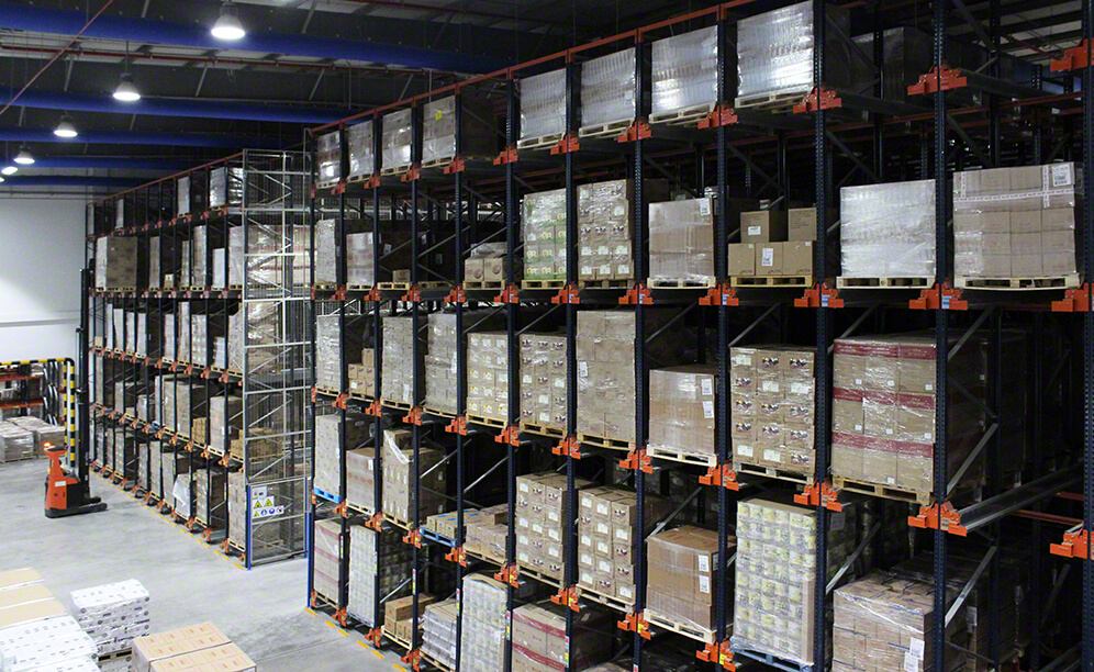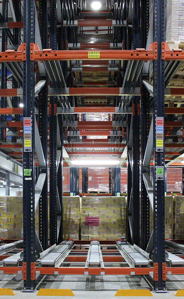 Mecalux has installed ten blocks of push-back racks. And, below, it has set up a picking passageway where workers collect SKUs meant for each order, picking items directly off pallets located in the live storage channels.