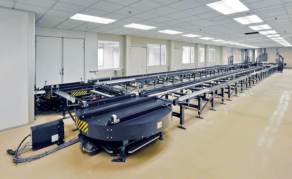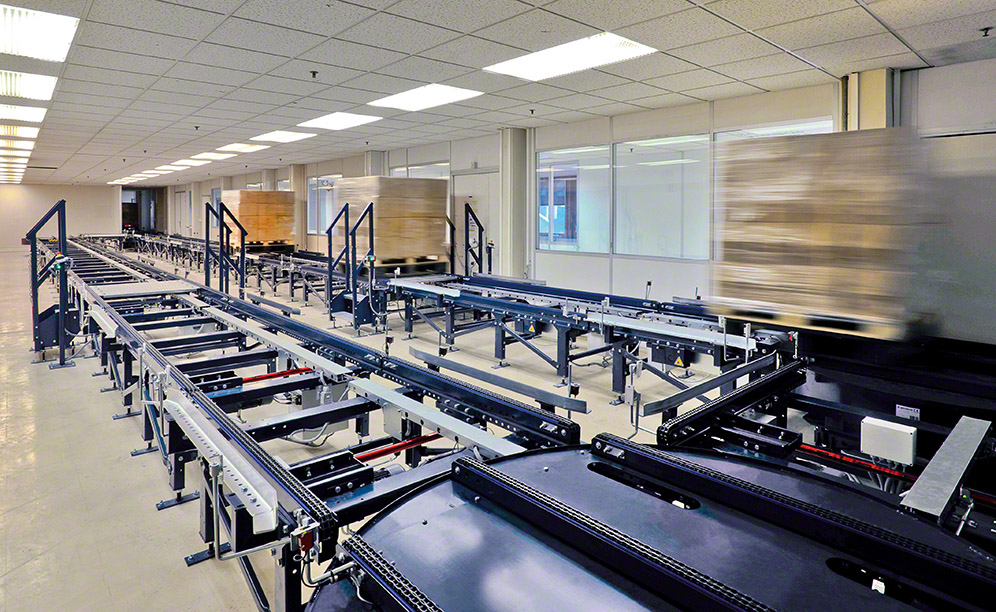 At the beginning of the circuit, workers operate forklifts to insert pallets on a hydraulic table, which lifts the load to the level of the conveyor. Once the pallet arrives at its destination, another hydraulic table lowers the pallet to the ground level where operators extract it from the circuit.
