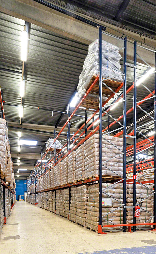 The three zones of the warehouse are fitted out with this type of racking. Adept at storing a huge quantity of pallet with many different SKUs, the racks are arranged differently in each one of the sectors to adapt to the massive variety of available products.