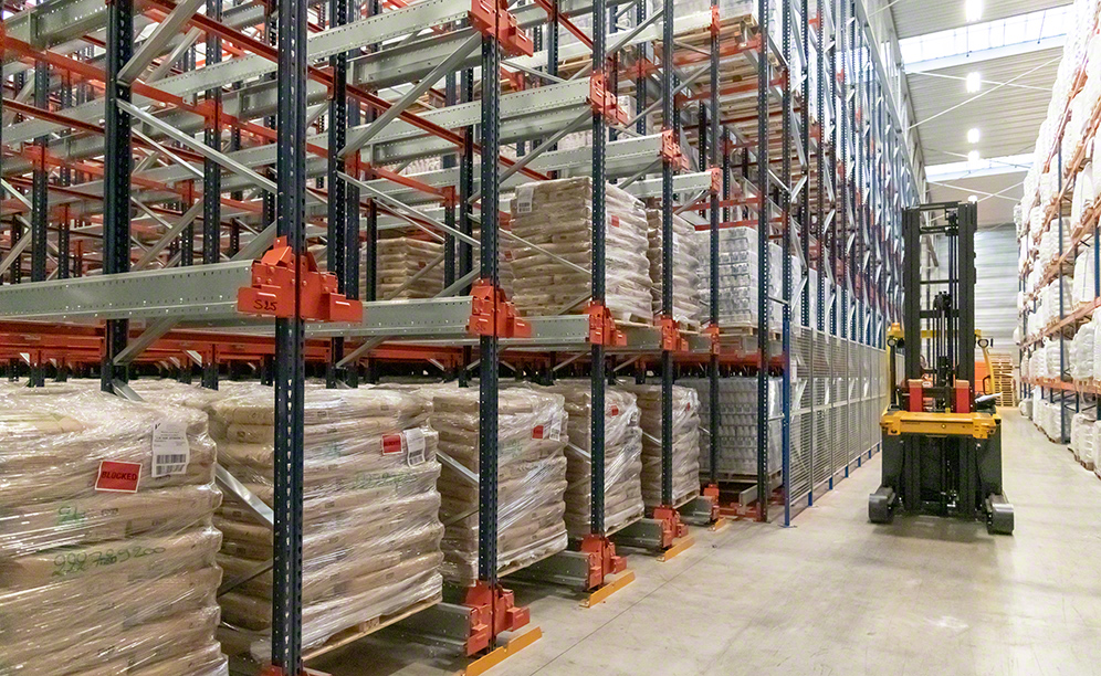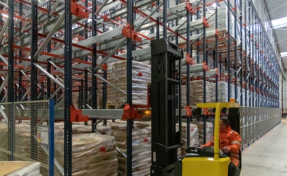 Two blocks of 9 m high racks are used, each with five levels and 29 m deep. In a total of 125 channels (each corresponds to one SKU-type and can hold up to 23 pallets), the result is storage capacity for 2,875 pallets. “We are extremely pleased with this solution because it harnesses existing space, as it can store up to five pallets high,” says Paul Van Werveke, the head of warehouse operations at Zuidnatie. Most products are industrial bags (better known as big bags) placed on pallets for easy handling. “The rack structure is adapted to the unit loads' characteristics and dimensions, mainly very heavy products, of up to 1,050 kg,” explains Paul Van Werveke.