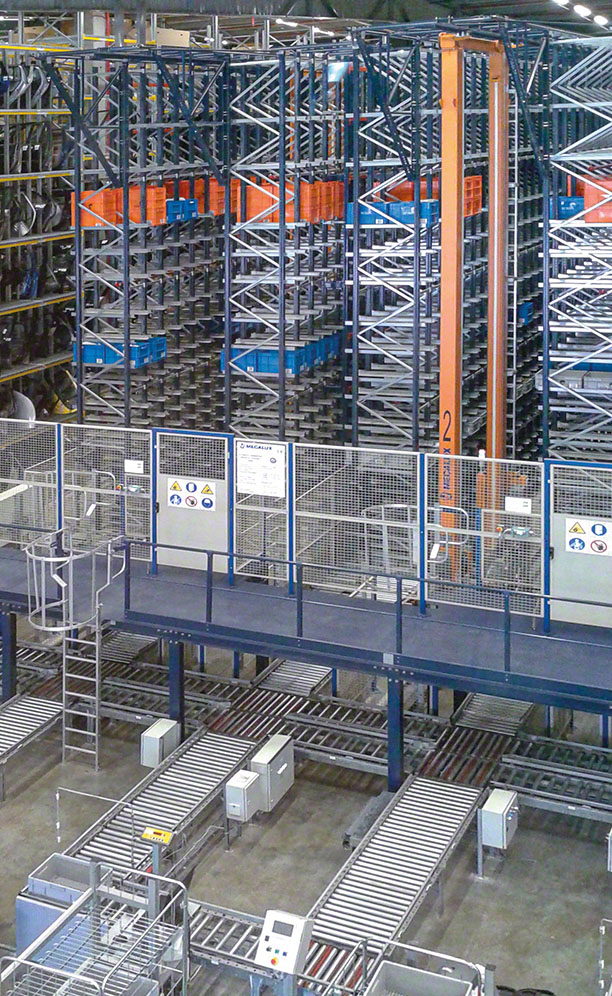 Measuring 10 m high, the facility comprises three aisles with double-deep racking on both sides. It has a storage capacity of 19,320 boxes in a surface area of merely 700 m² de superficie. A twin-mast stacker crane incorporating a double-box, double-depth extraction system moves along each aisle, and can handle up to four boxes at the same time. In this way, the flow of goods from the automated installation increases considerably, and 730 boxes/hour (365 incoming and 365 outgoing) can be stored and retrieved.