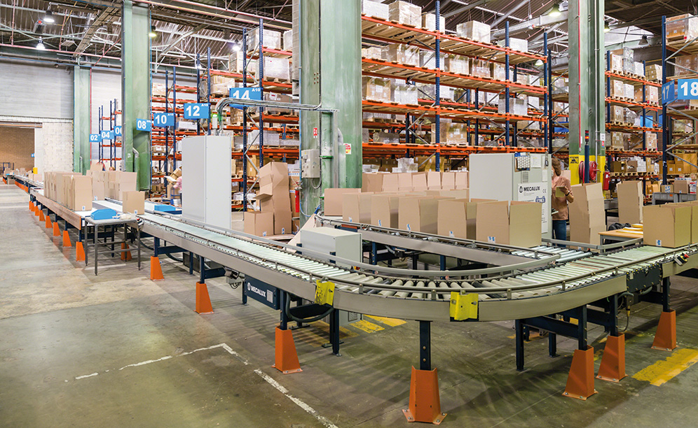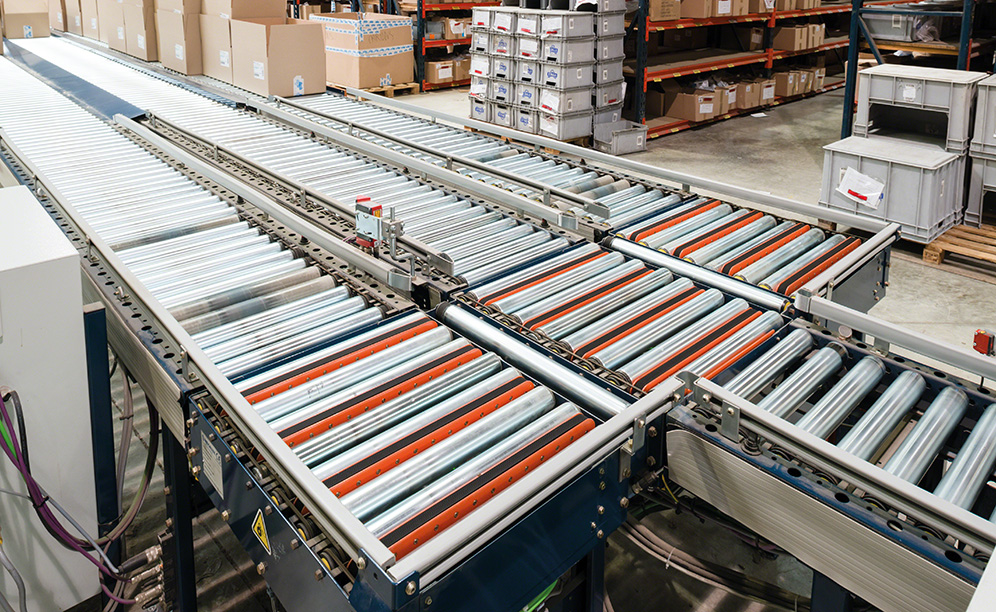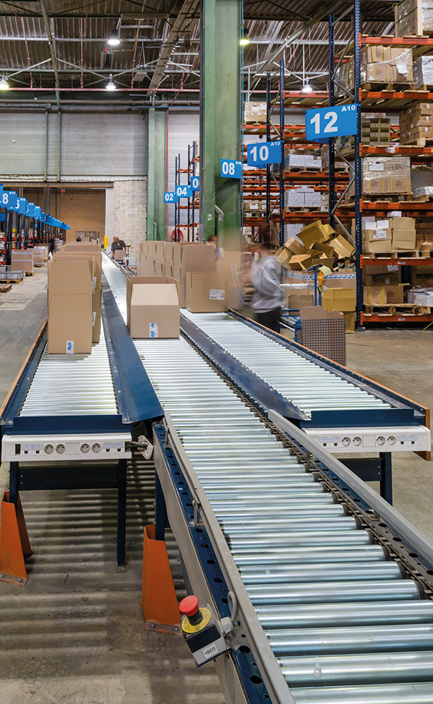 The conveyors are adapted to the features and distribution of the warehouse. The circuit incorporates straight and curved lines, as well as three open passageways to facilitate access of personnel through hinged conveyor sections. Once operators have crossed through, they put it back into position for the goods to continue moving.