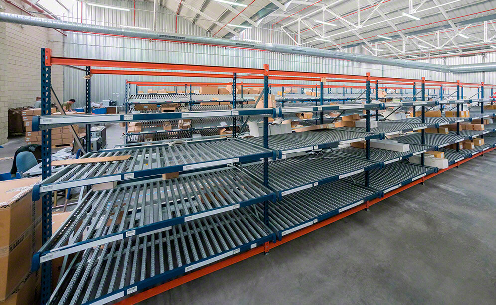 The 2.5 m high racks contain four inclined levels, comprised of roller track platforms to let boxes slide via gravity. Sloped display trays are also available, which ease access to merchandise inside the boxes.