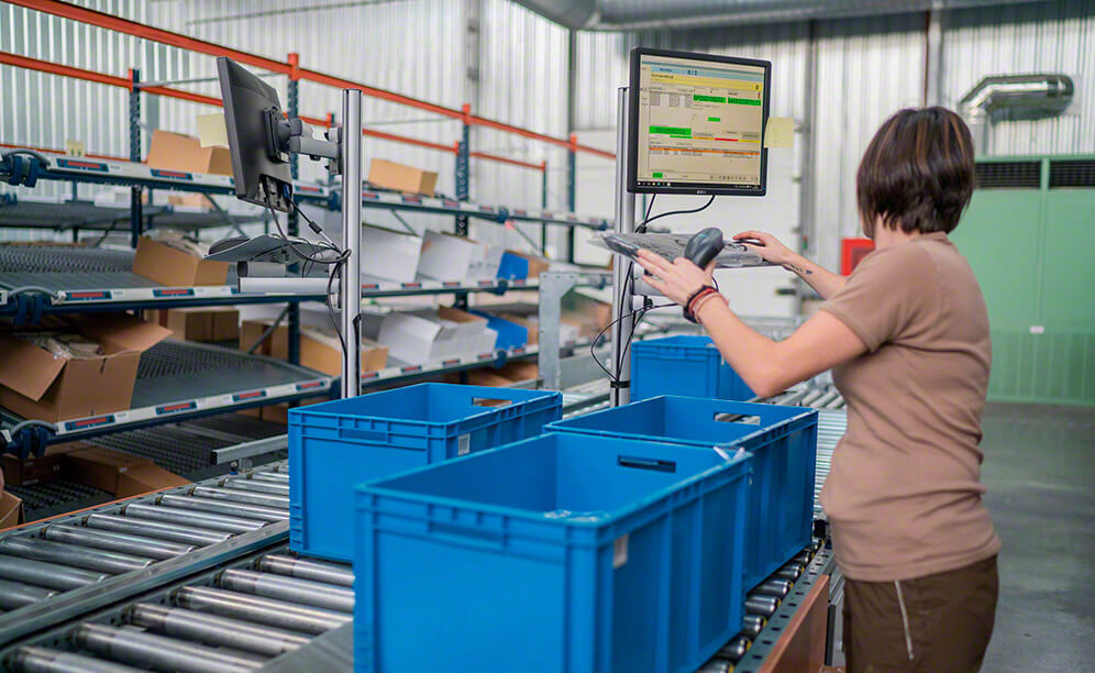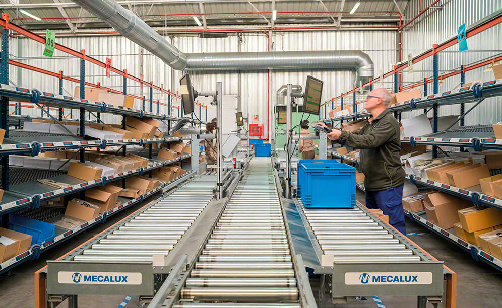 The centre’s WMS is in permanent contact with the Galileo control module from Mecalux, tasked with issuing movement commands to the conveyor circuit and directing boxes to the corresponding picking stations.