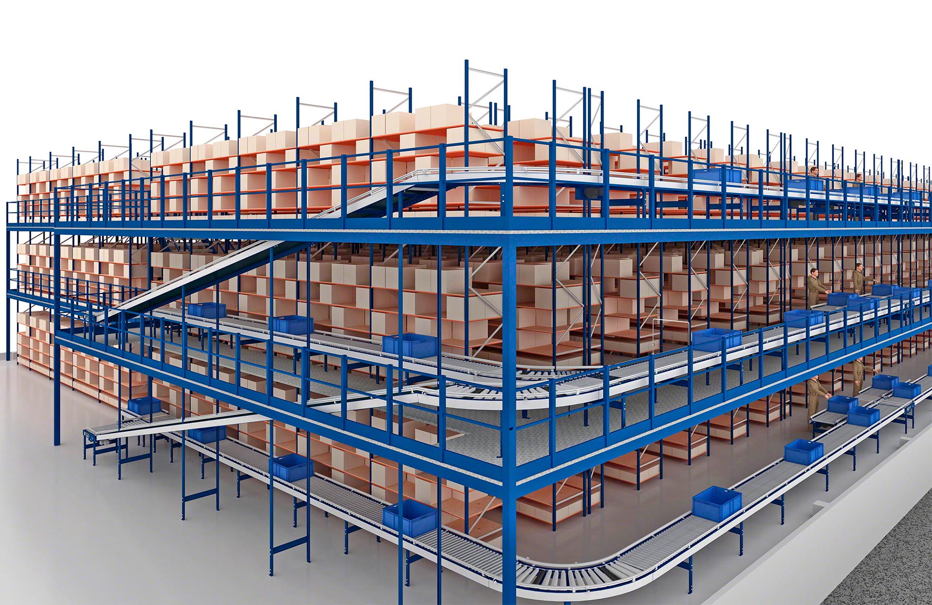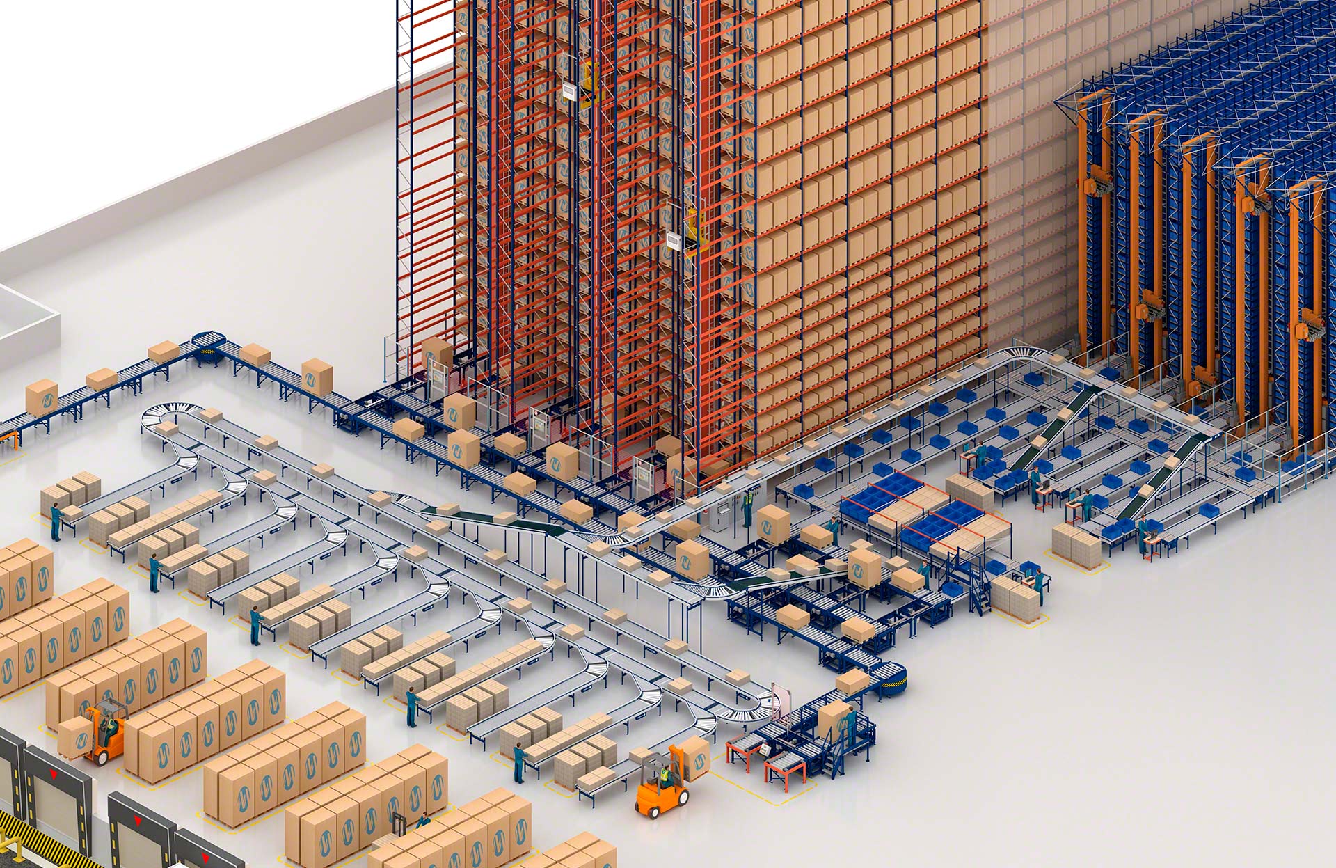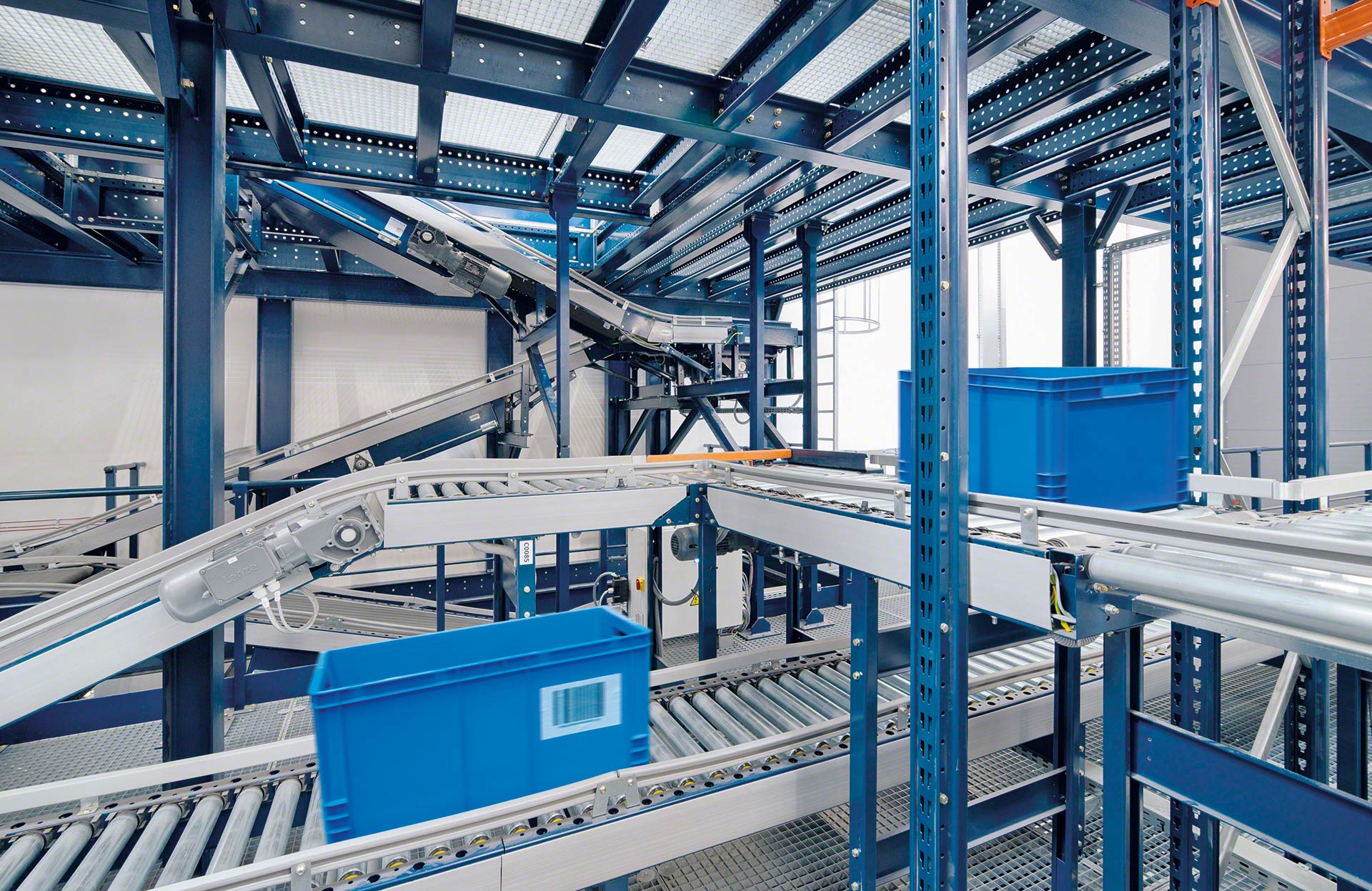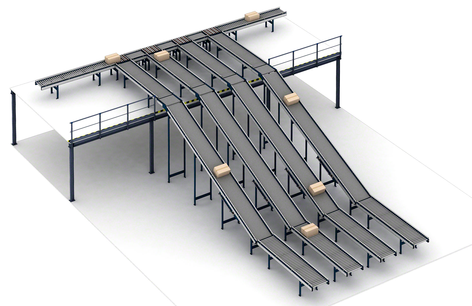 Thanks to Mecalux’s wide range of conveyors, any type of layout can be designed, from simple straight-line systems with one point of origin and one destination to complex circuits with multiple entry and exit points. This versatility ensures the system adapts to specific operational needs. Curved conveyors, for example, help navigate architectural obstacles, while cross transfer conveyors change the direction and orientation of unit loads.