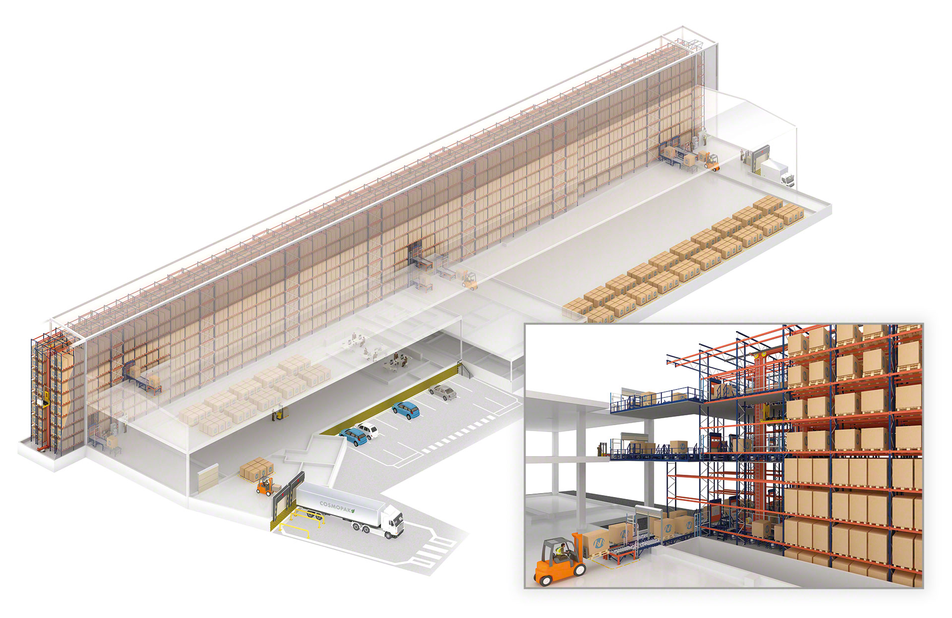 - Maximum space utilisation: stacker cranes can reach up to 45 m high in aisles as narrow as 1.5 m wide.