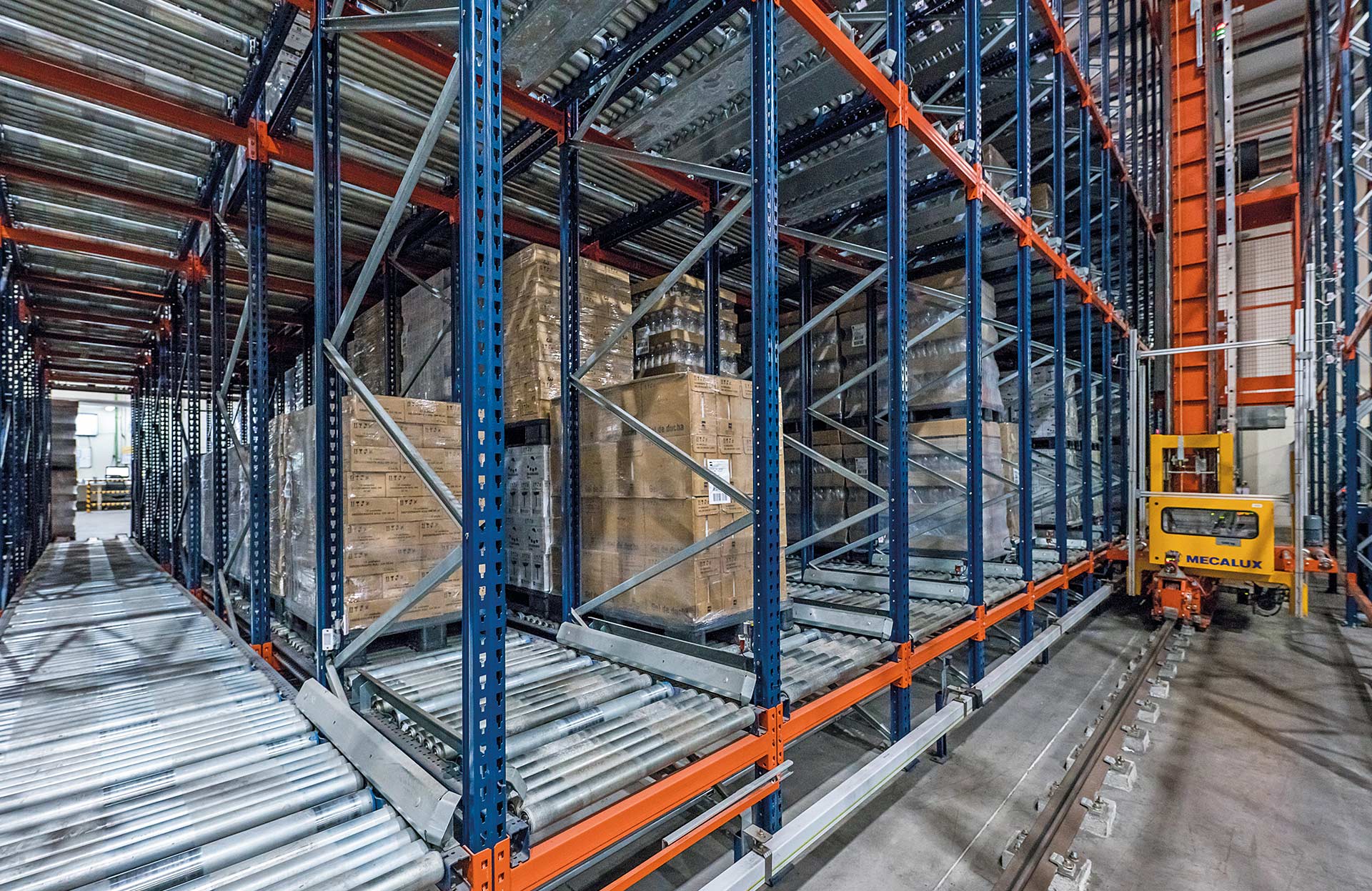 Mecalux stacker cranes can operate with single- or double-deep racking, pallet flow racking or the Automated Pallet Shuttle system.