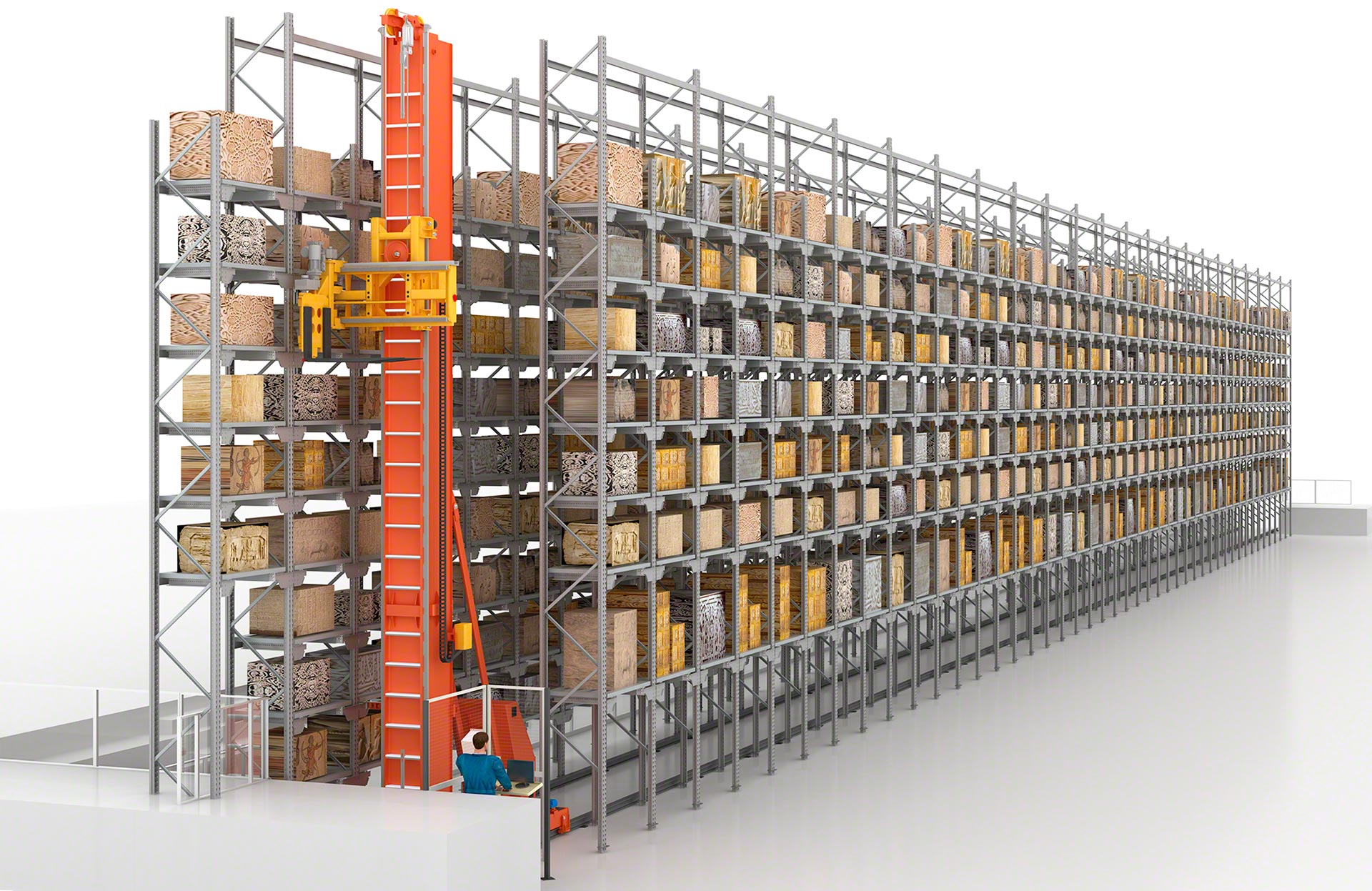 Not at all. This is the simplest type of stacker crane, specifically designed to automate conventional warehouses previously operated with trilateral forklifts. In fact, these stacking cranes can be implemented without altering the existing racking layout or aisle width.