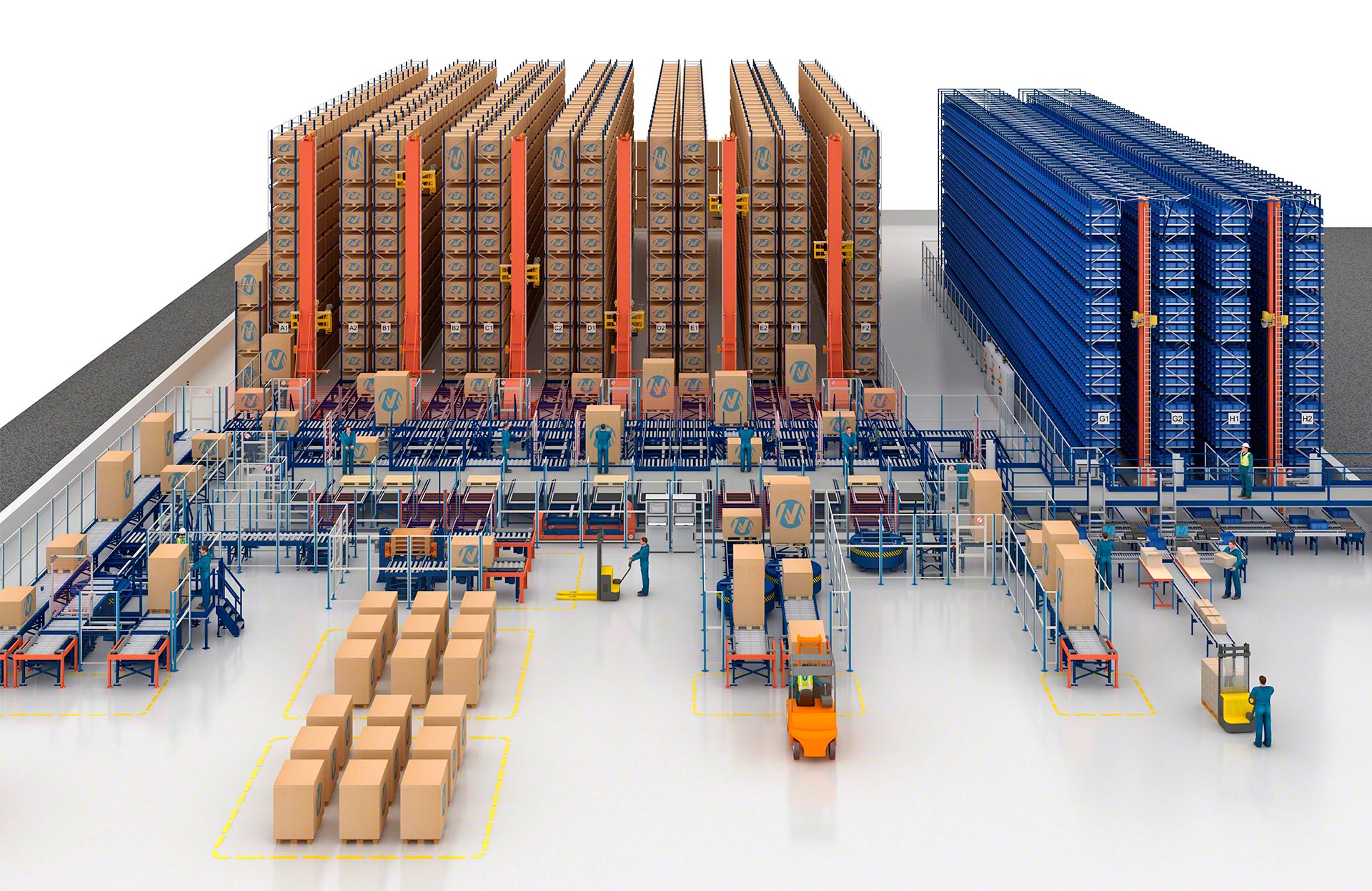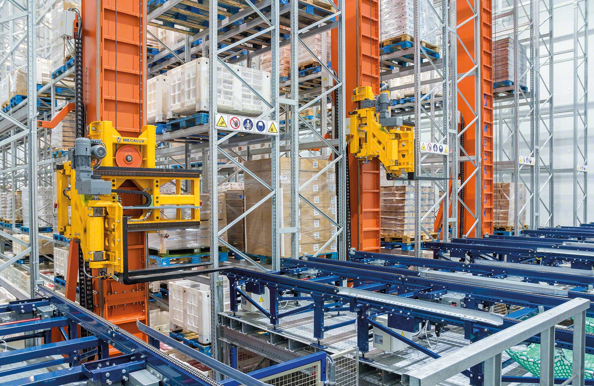 Automated trilateral stacker cranes can handle pallets weighing up to 1,200 kg.