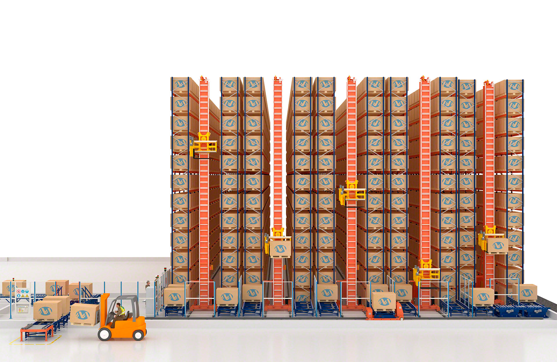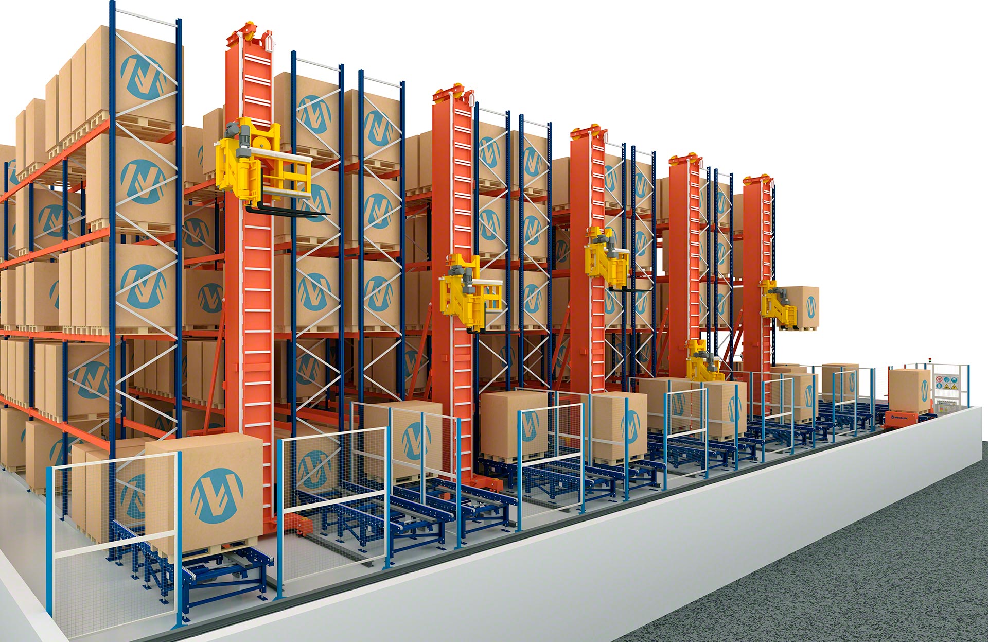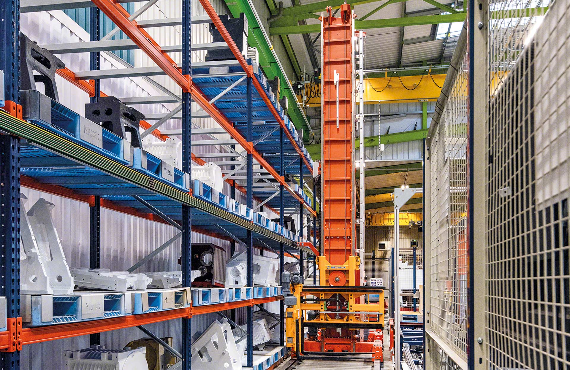 - Maximum space utilisation: unlike other stacker cranes, they operate from floor level and require no upper guide base, allowing full use of warehouse height.