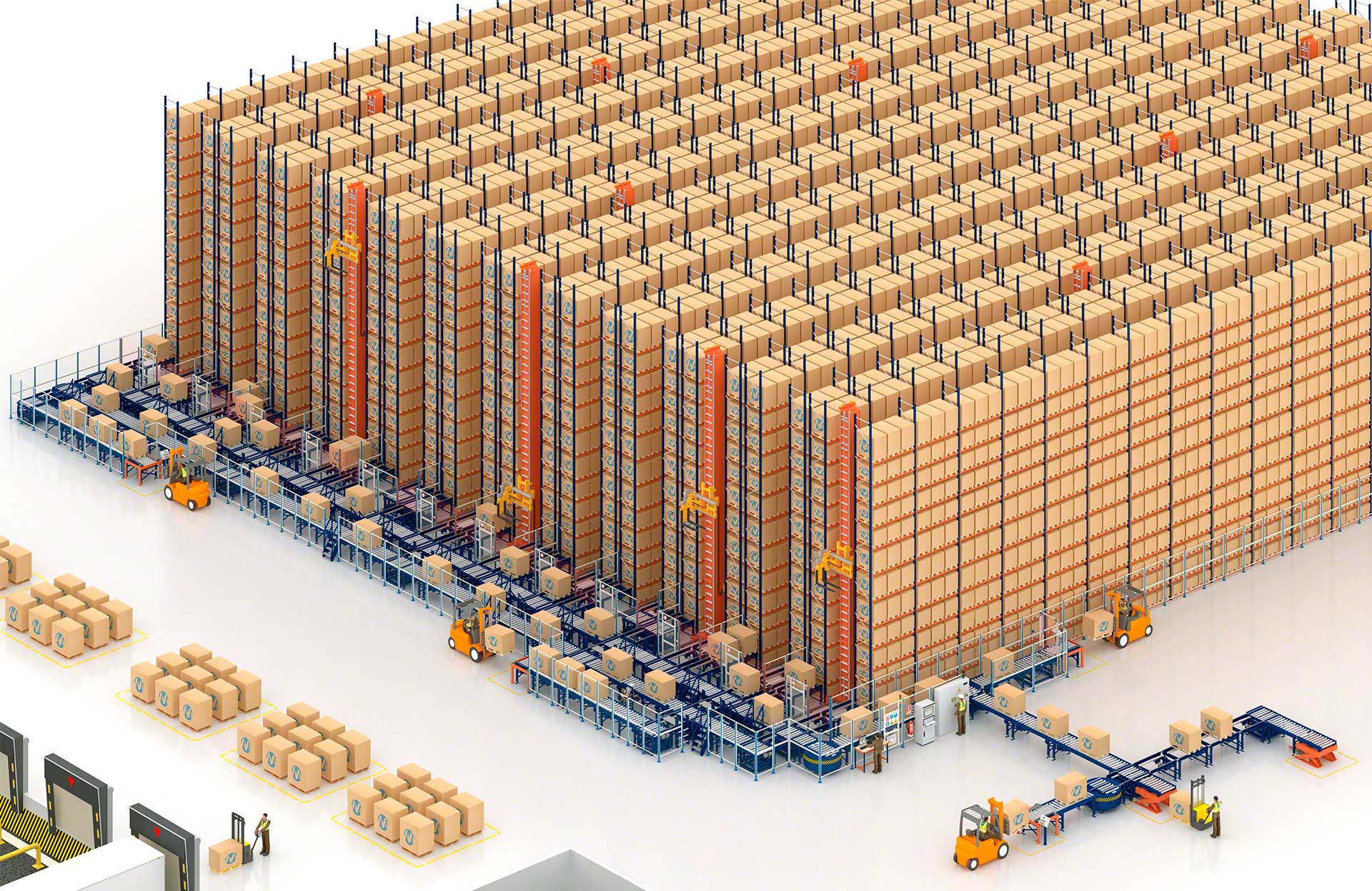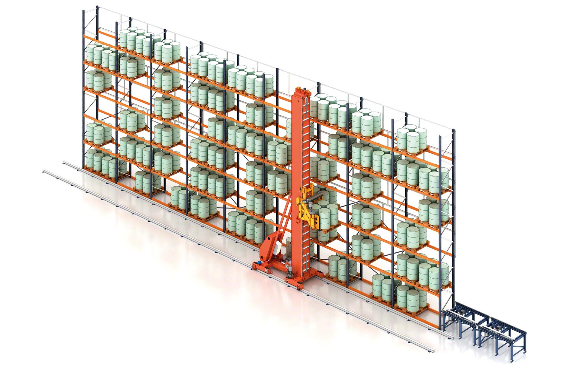 - Total automation: when integrated with a pallet conveyor system at the front of the racking, automatic stacking cranes enable completely automated load handling.