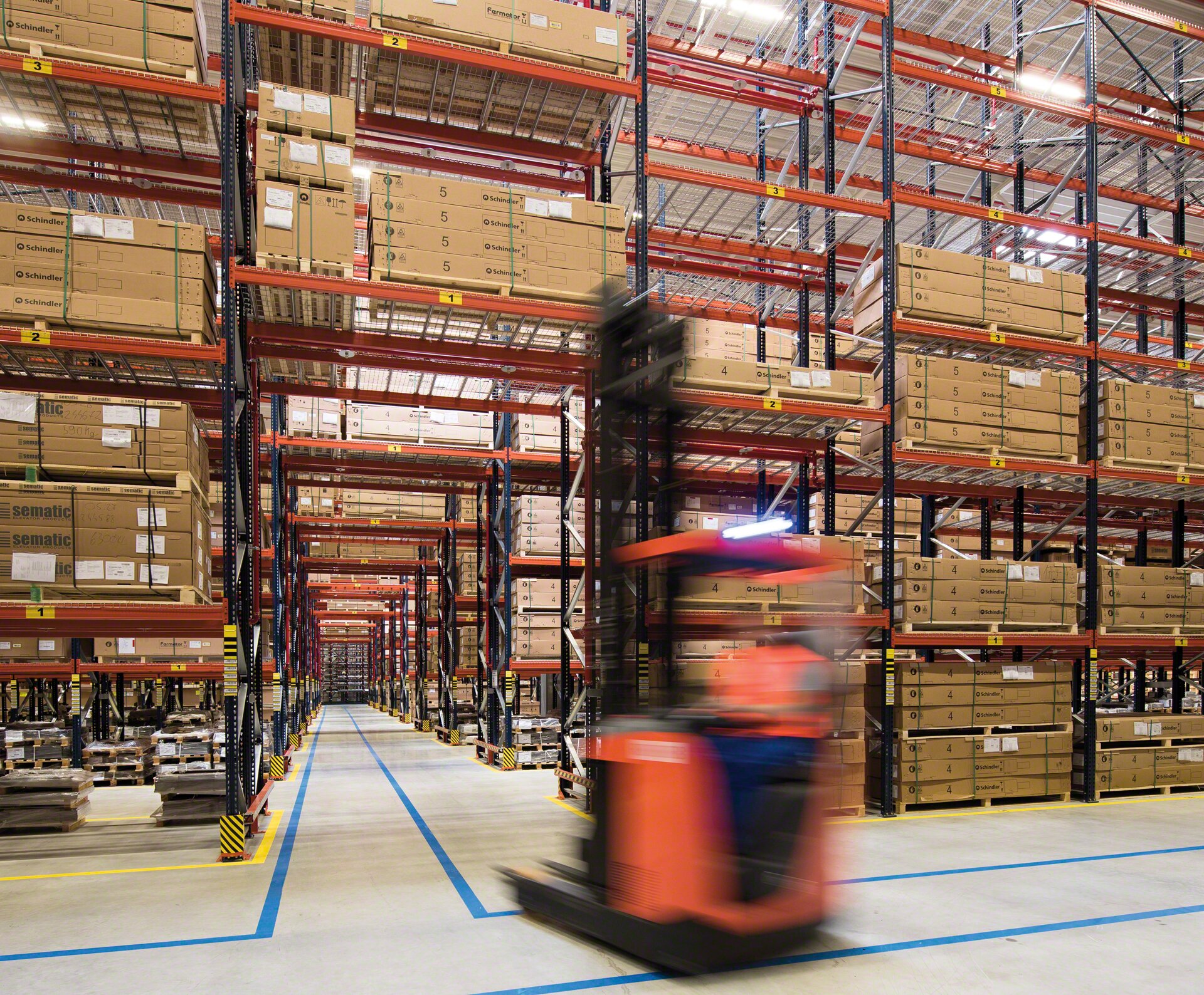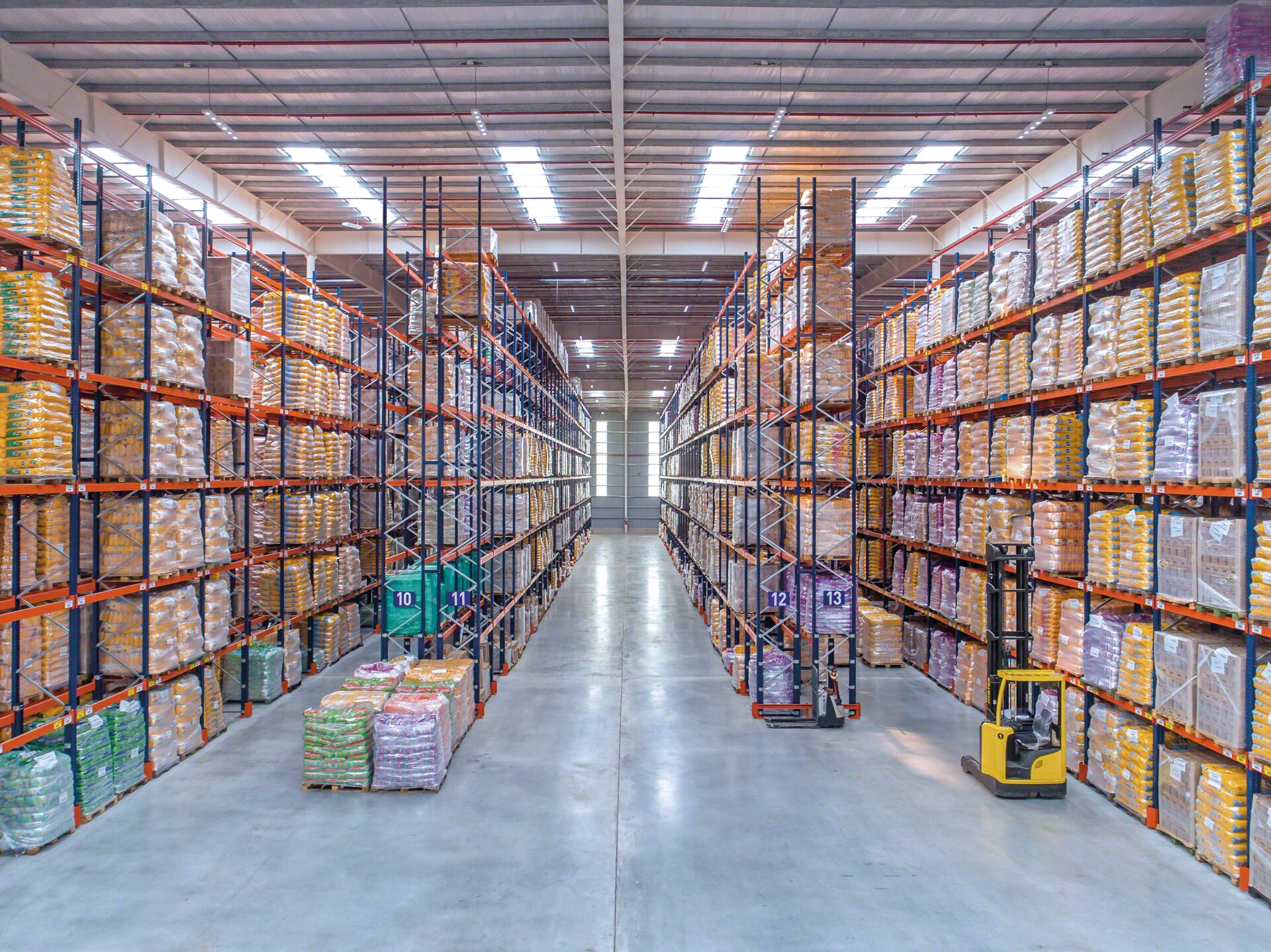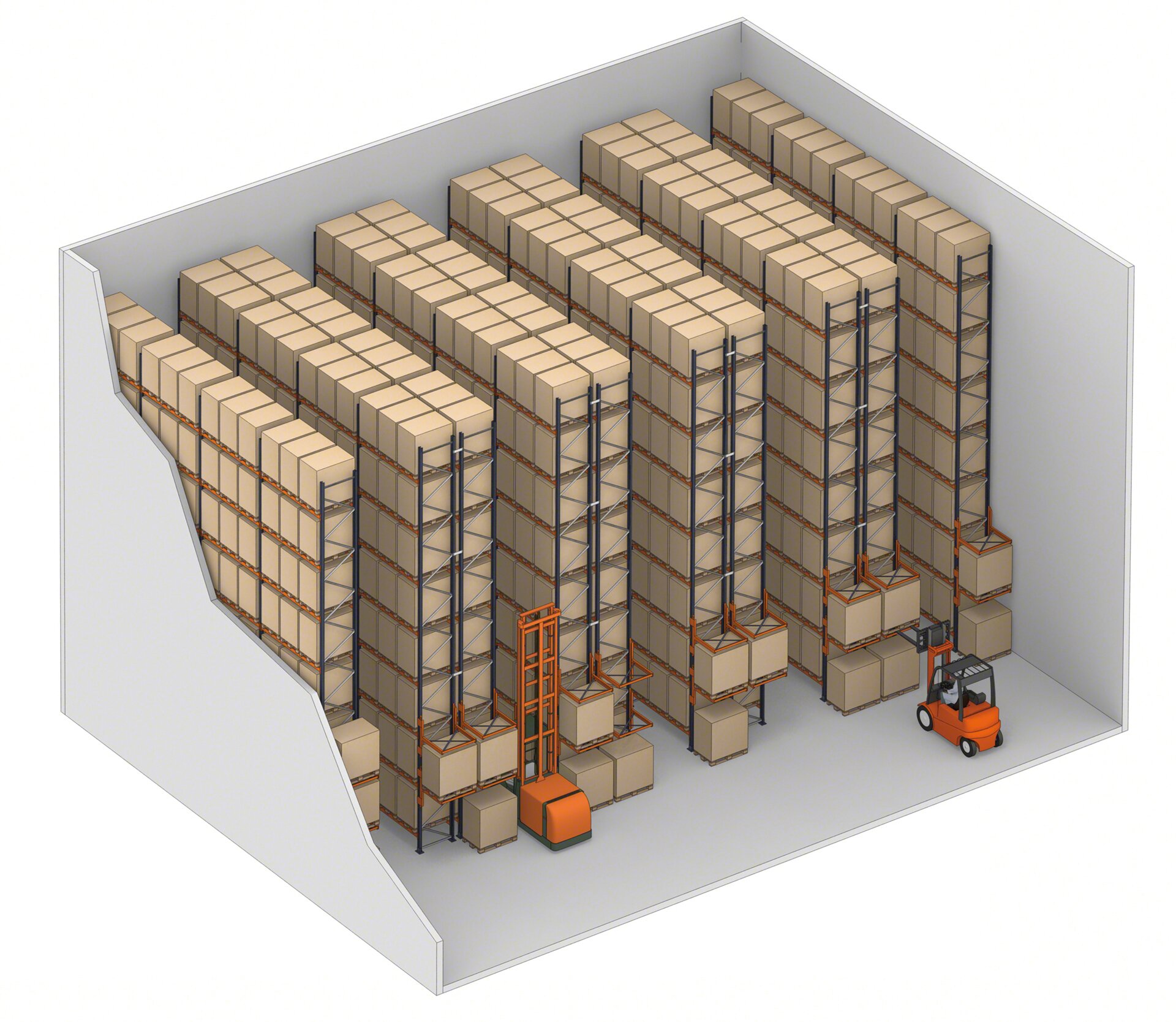 Any type of forklift can be used (counterbalanced, reach trucks, VNA trucks, etc.), as long as the aisle has the appropriate width and the machines can reach the upper load levels. In the case of double-deep pallet racking, the forklift employed must have telescopic forks to reach the pallet furthest away.