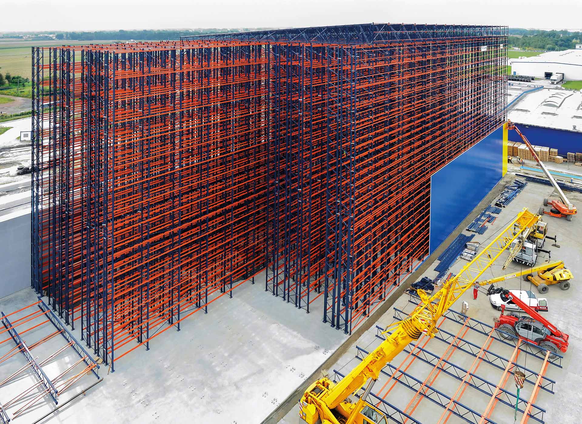 The definition of a clad rack warehouse is simple: it is a type of building in which the racking constitutes the main structural component of the construction system. For this reason, in a clad rack warehouse, the racking supports its own weight, that of the stored goods and that of the roof and façade cladding; the stresses of the handling equipment; and the action of external agents, such as wind force and roof overloads due to snow.