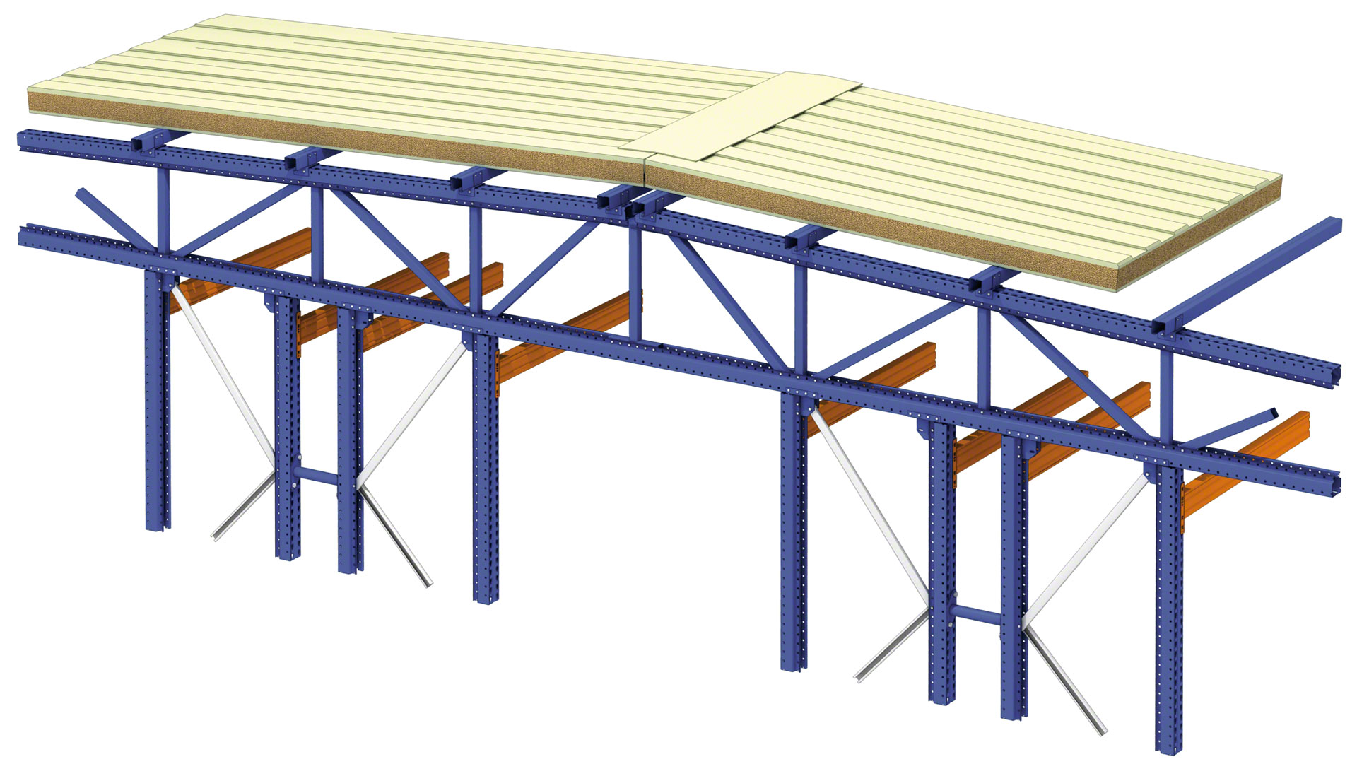 Comprehensive storage system in which the racking forms the structure of the warehouse. Space optimisation, cost savings and faster implementation.